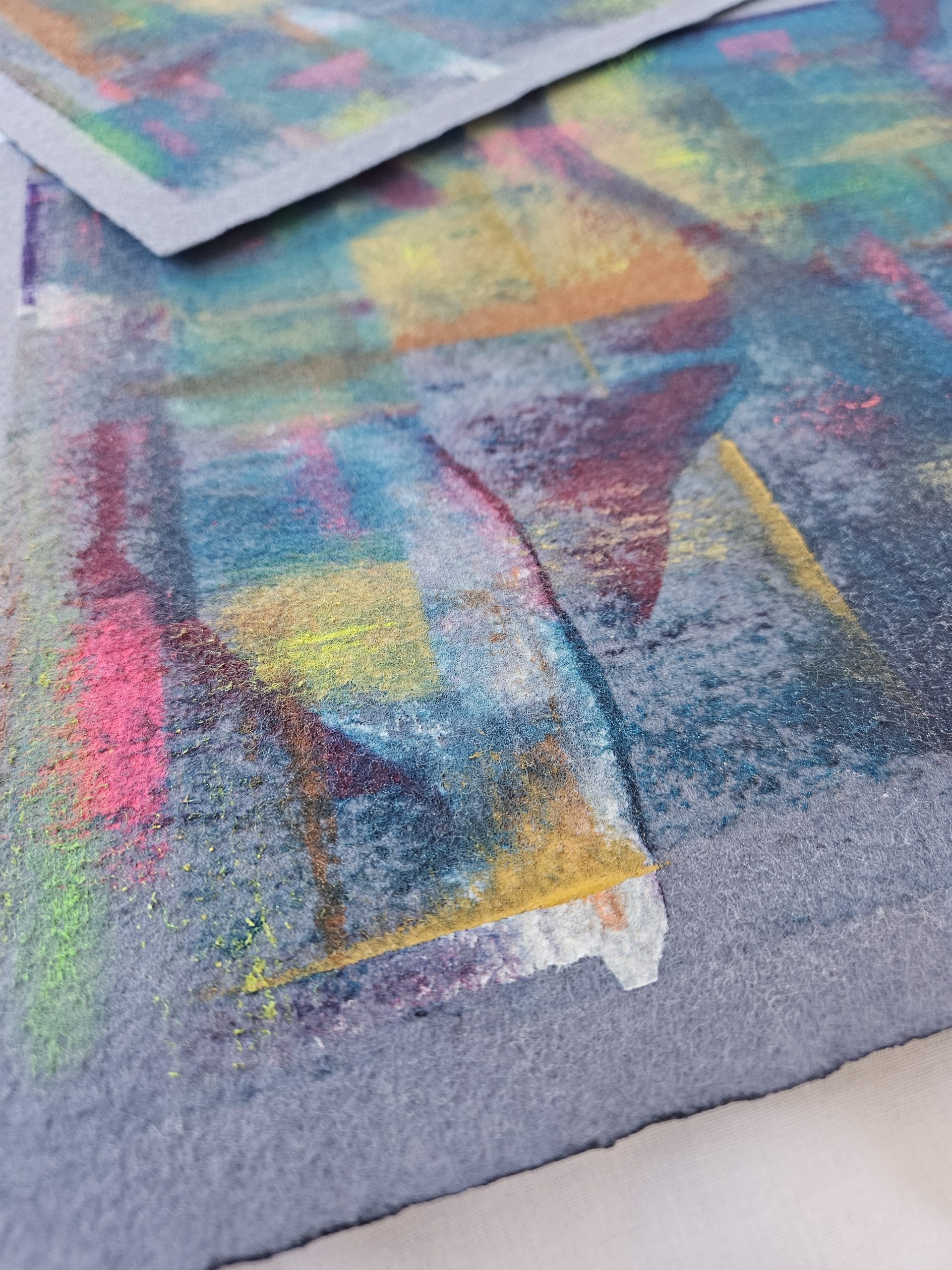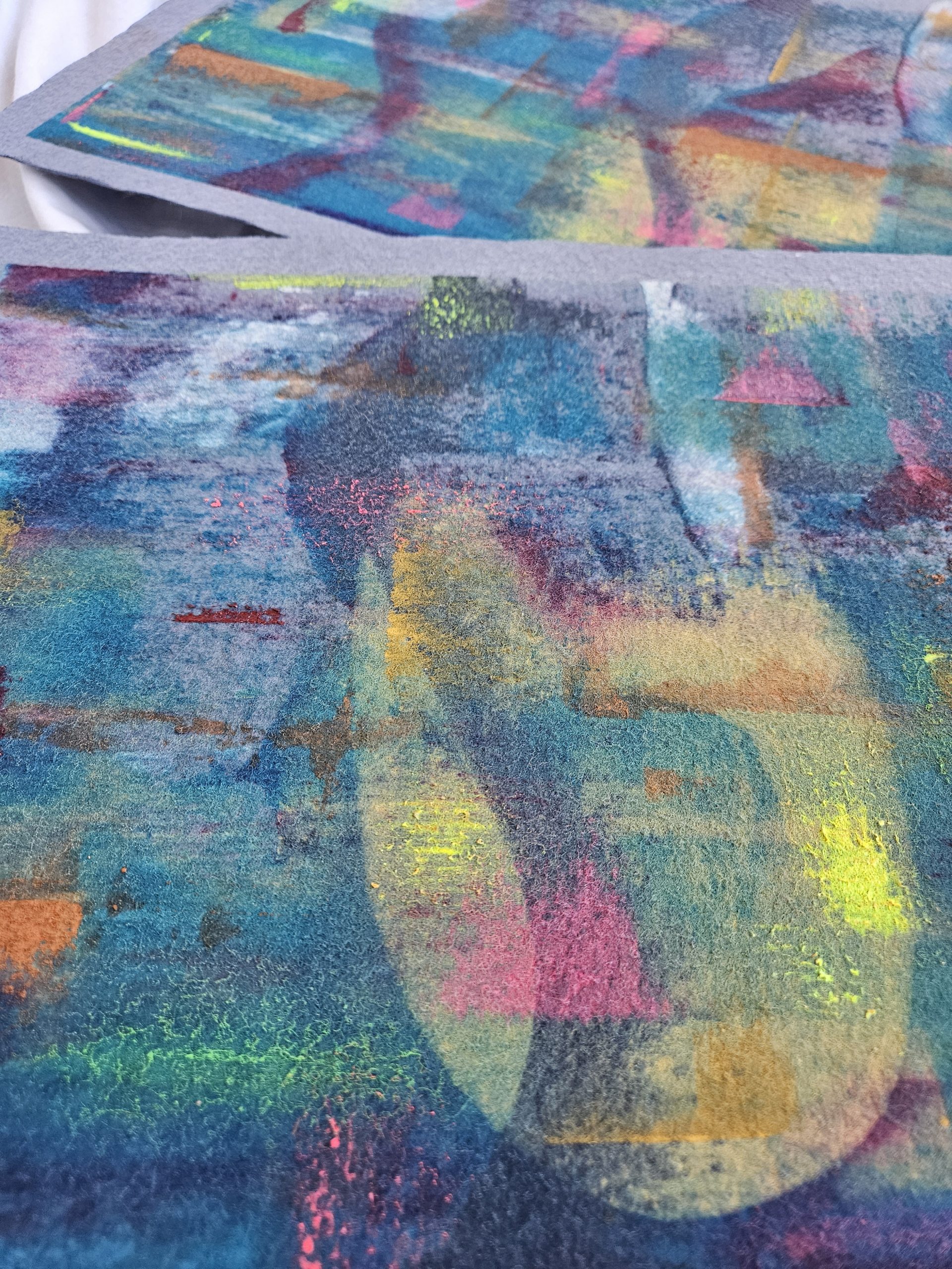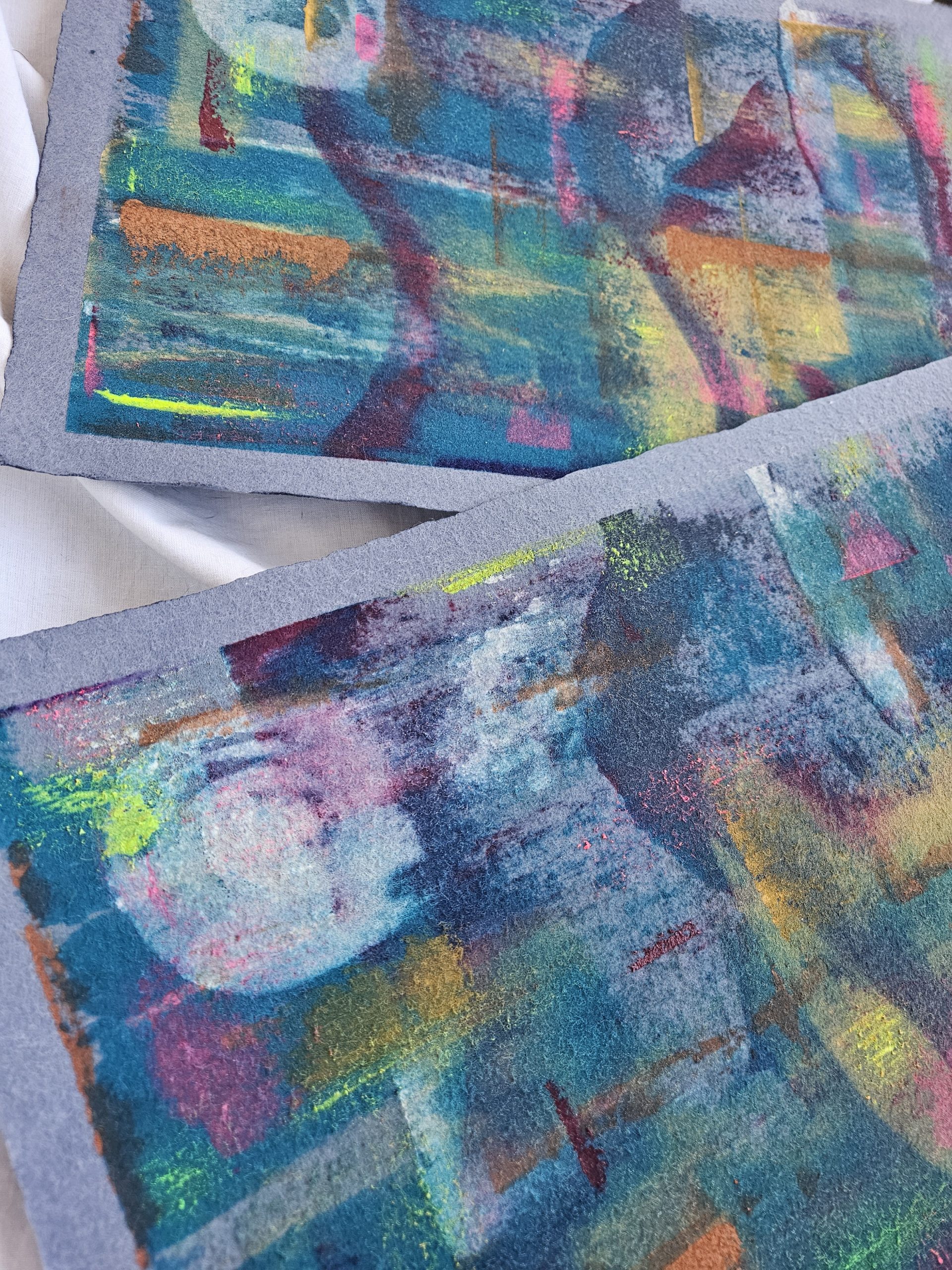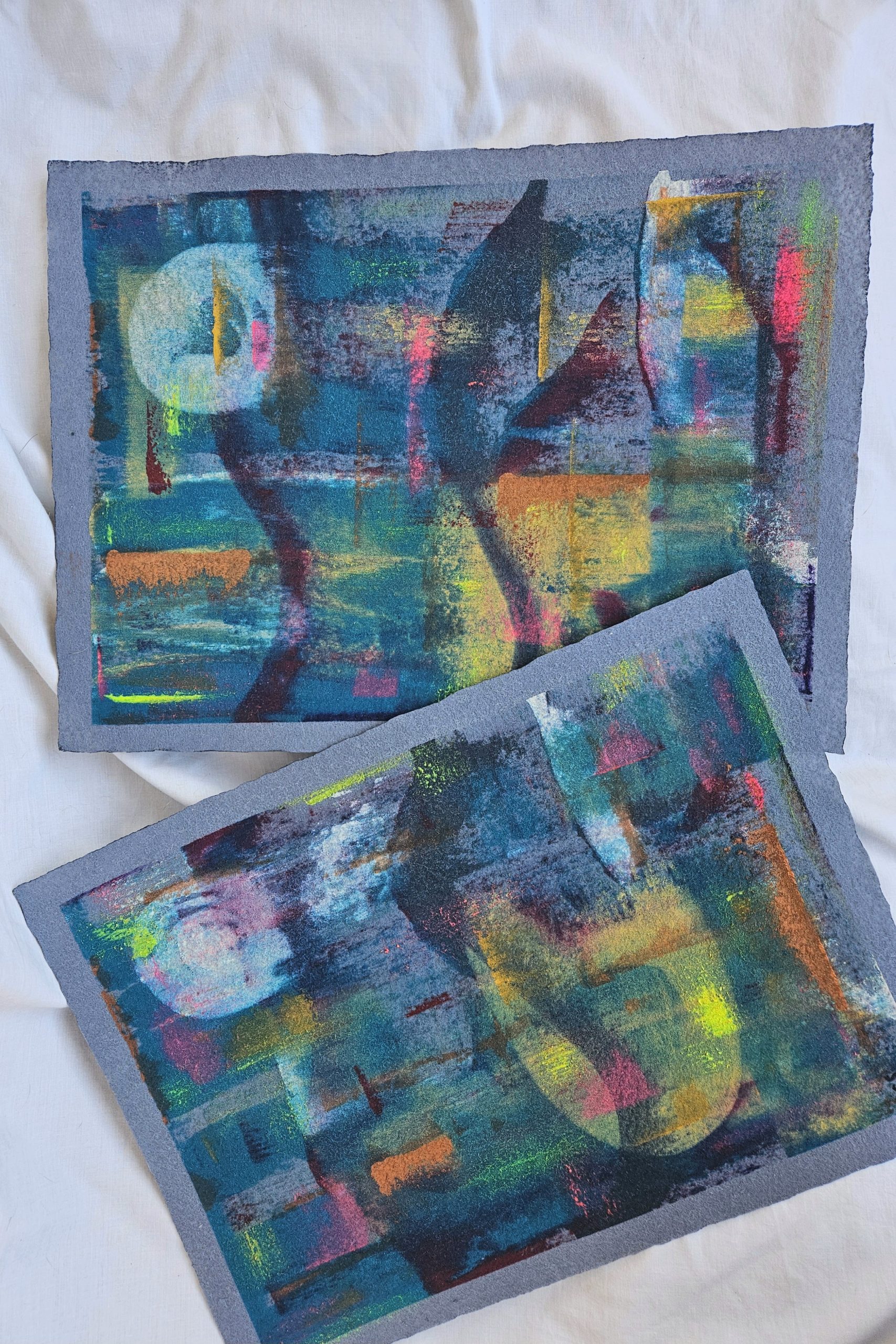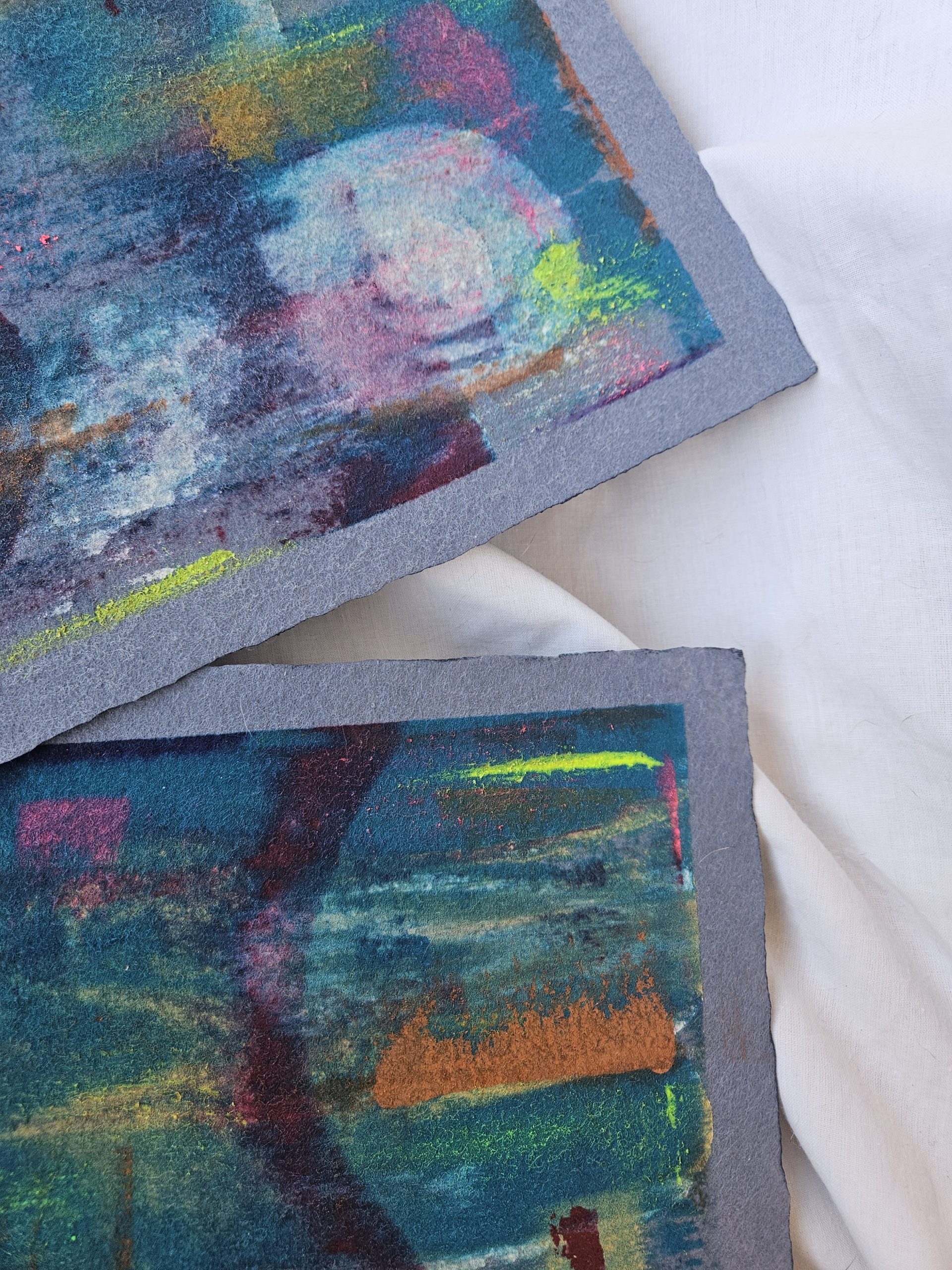 Originales láminas combinables y diferentes entre sí, pintadas a espátula en fieltro, listas para enmarcar y disfrutar de su colorida calidez.