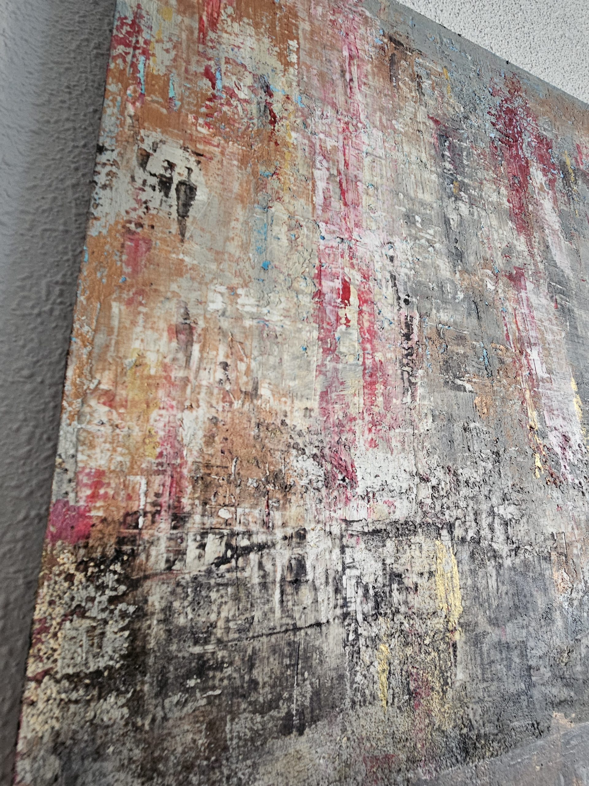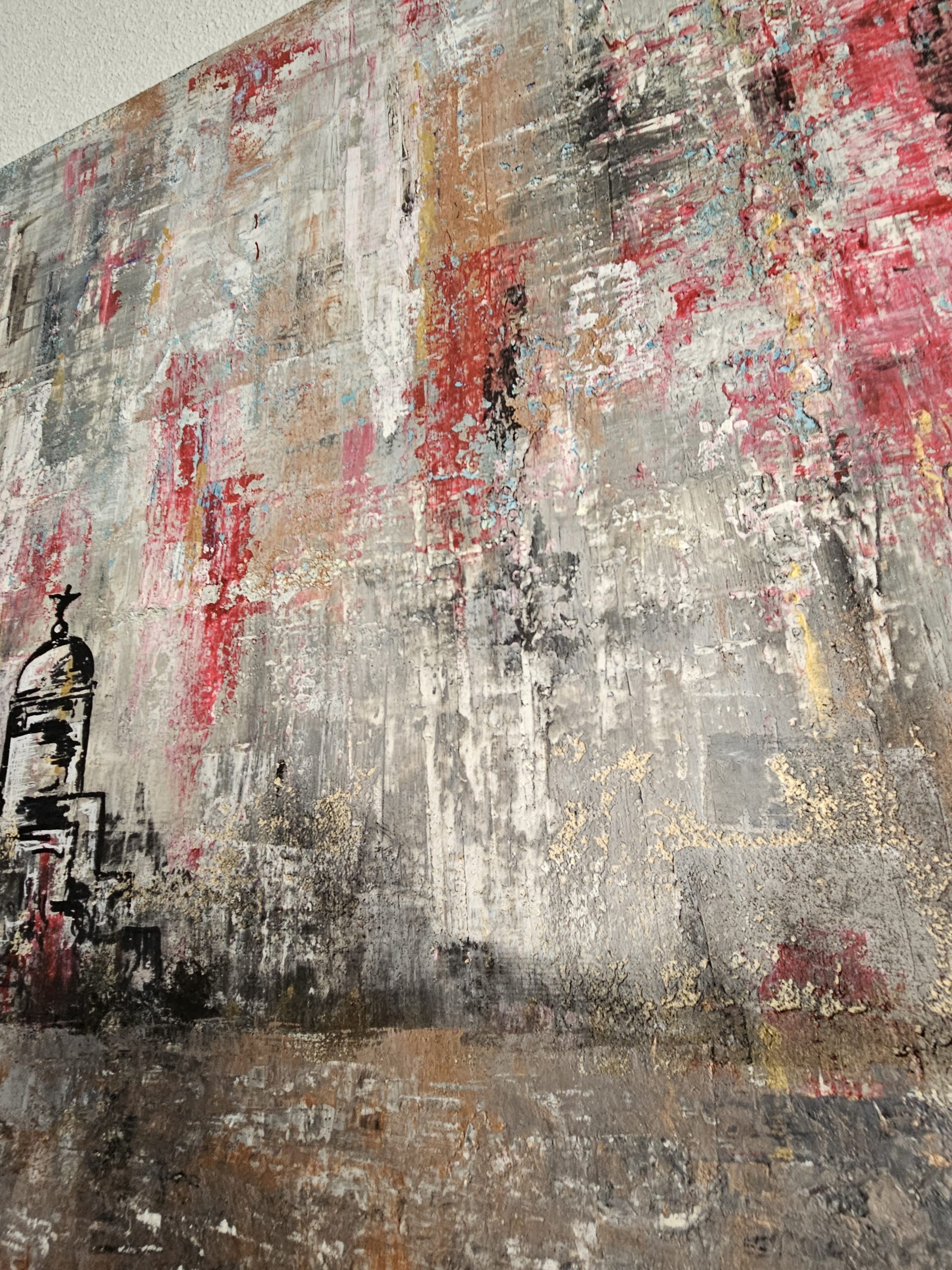 Acrílico texturizado, spray, carboncillo y rotulador sobre tabla de madera.