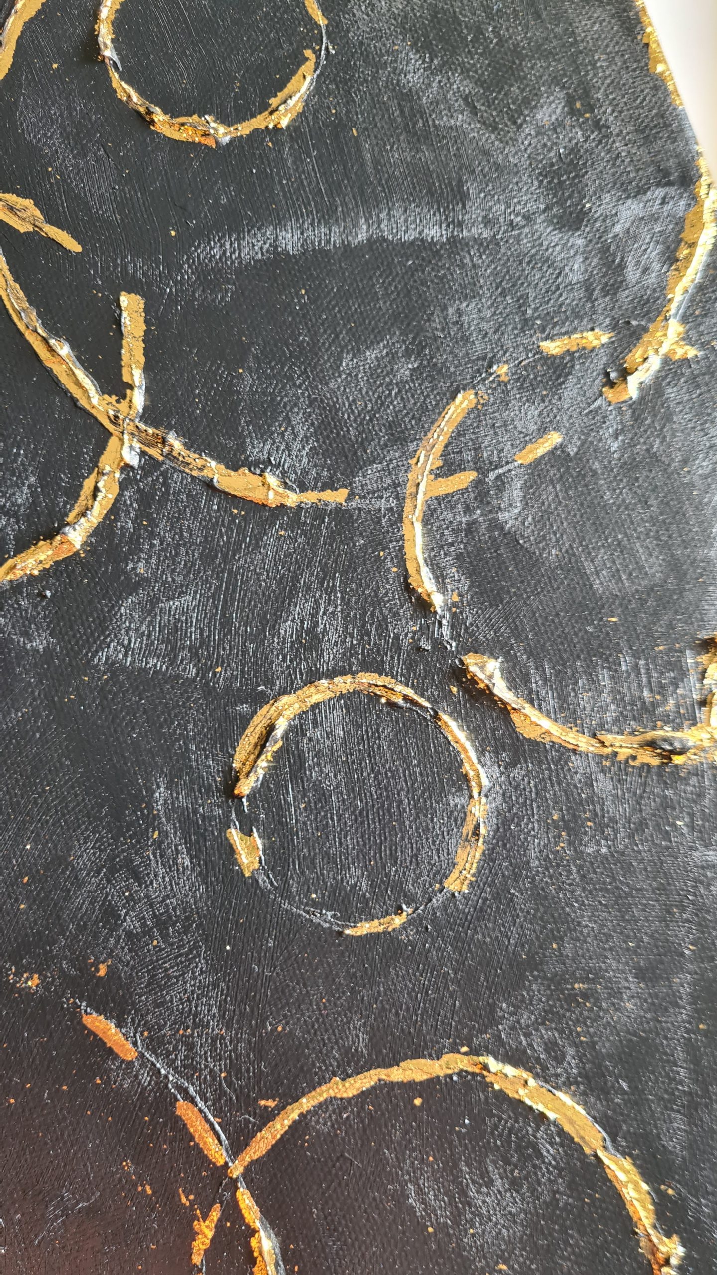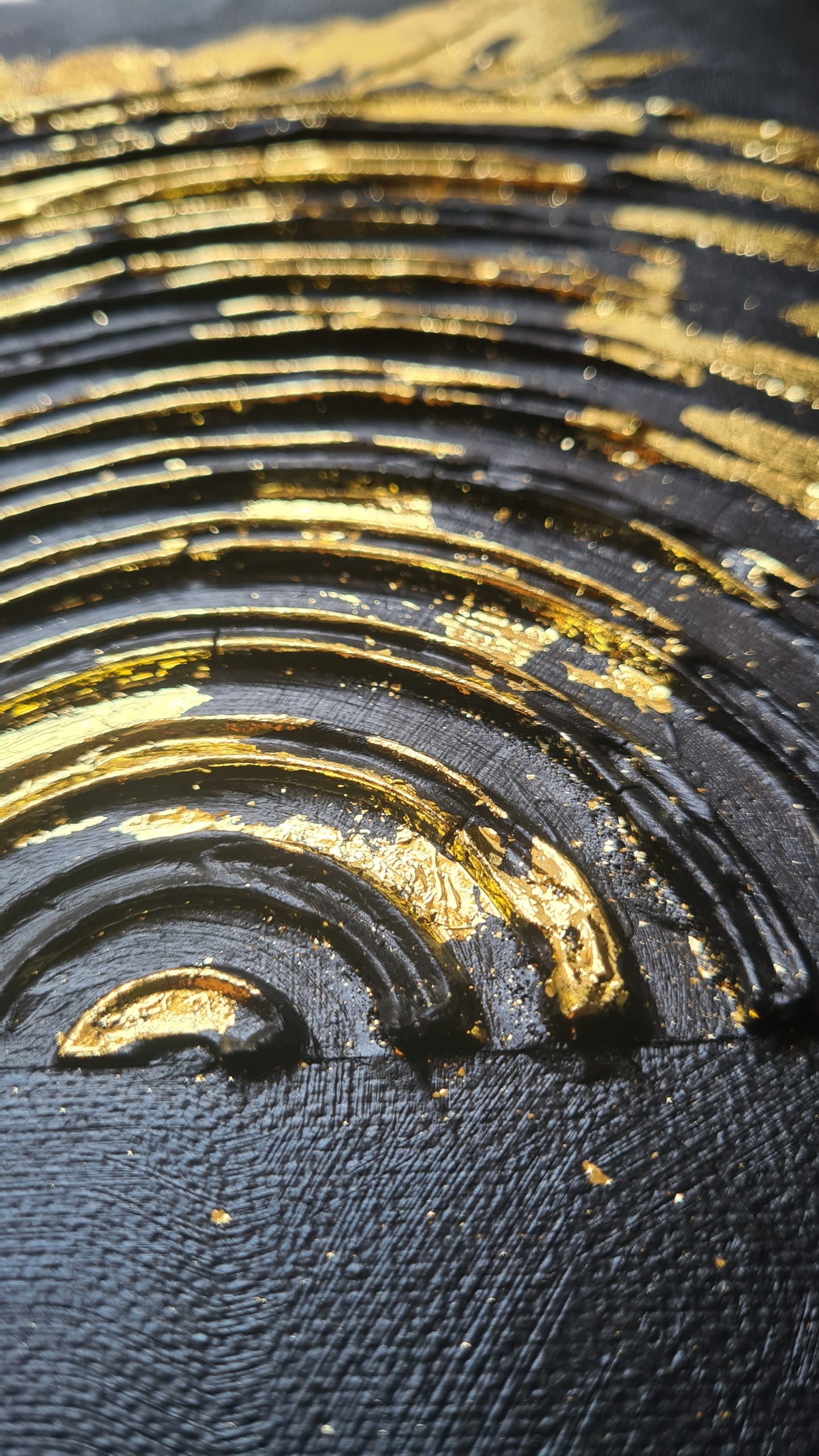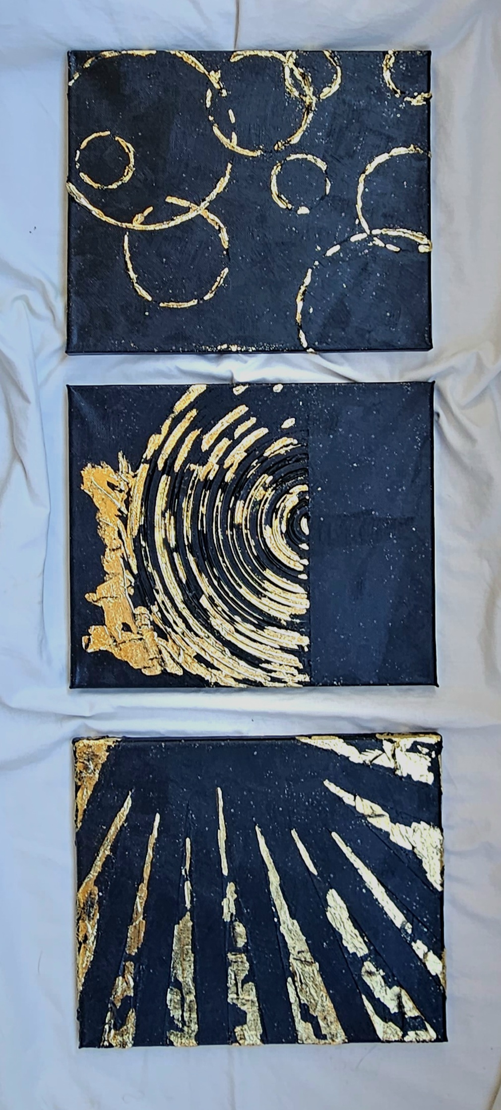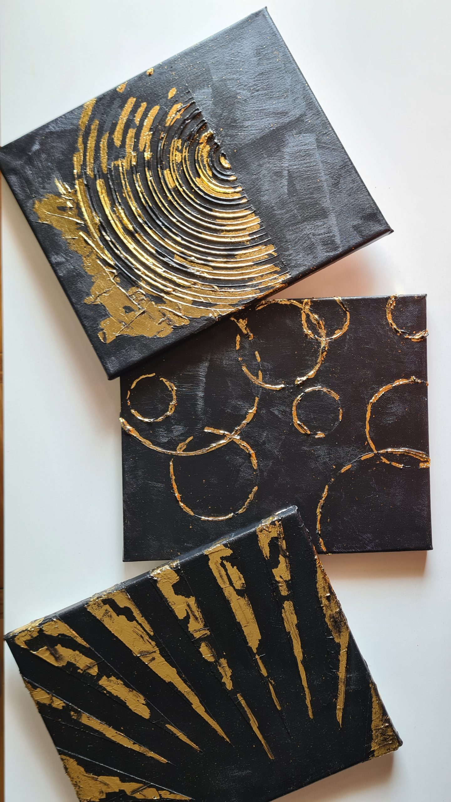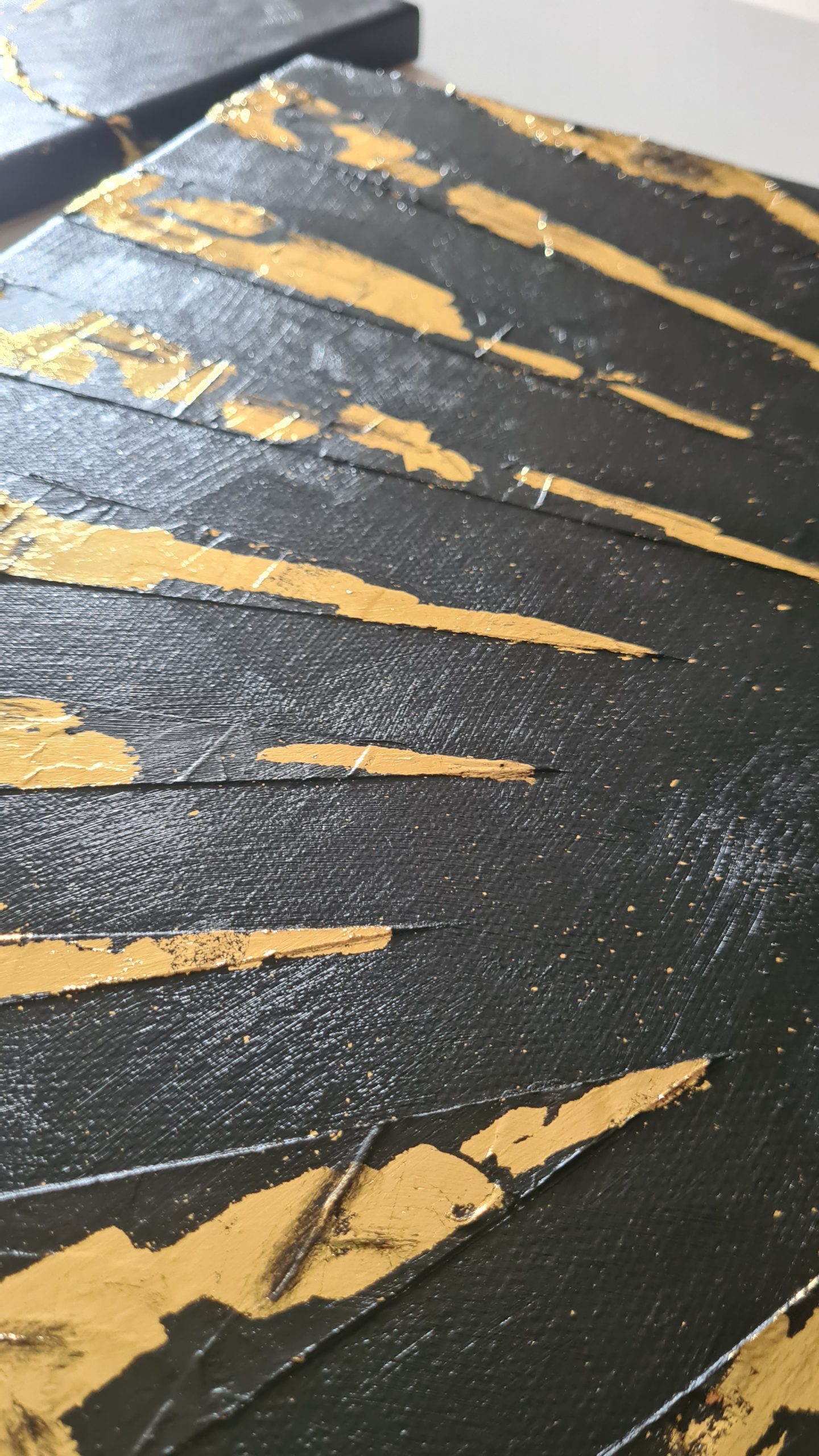 Composición tríptico combinable. Elegantes en negro y dorado. Destacan las texturas pinceladas con hoja de oro. Se adquieren juntos.